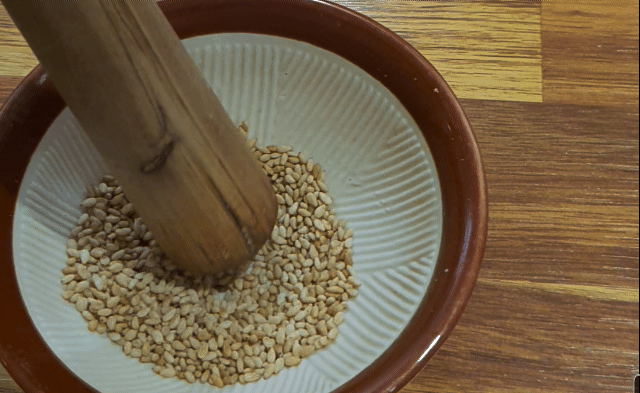 먼저 절구로 깨를 빻으며 메뉴가 나오기를 기다려본다.